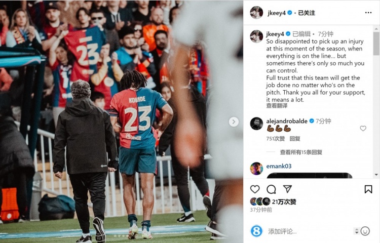 孔德在社交媒体上晒出自己因伤离场的照片,并写道:“在赛季的这个时刻受伤,我感到非常遗憾......但有时你能控制的事情不多。”