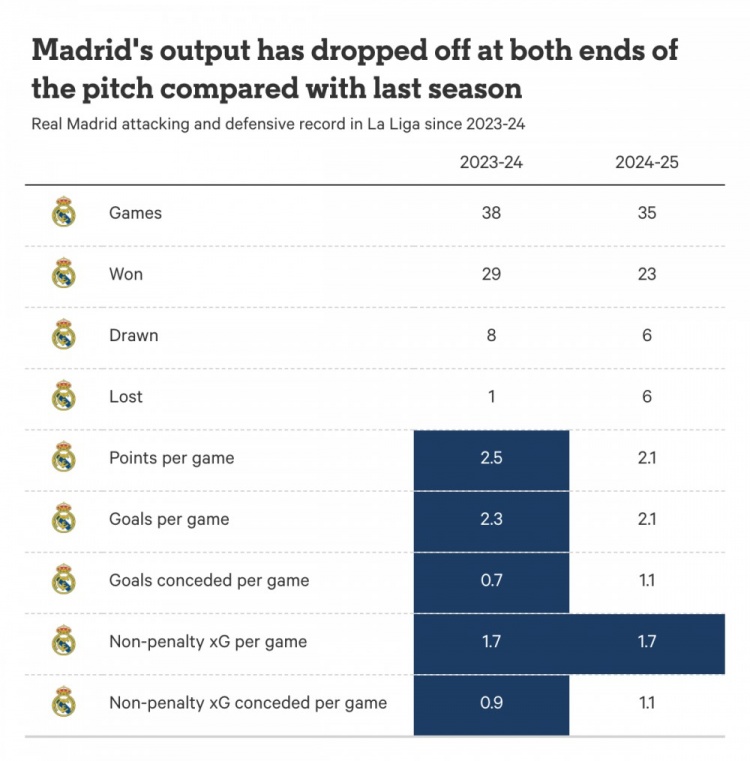 与上赛季相比,皇马攻防两端的数据都有下滑