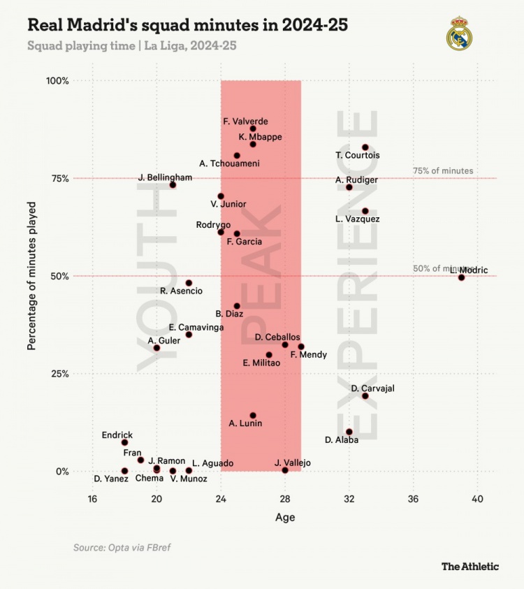本赛季安切洛蒂遭受的内部批评之一(来自首席球探胡安-卡拉法特等人)是其未给予居勒尔、恩德里克等年轻人更多机会。下方数据可视化图表显示,即便在伤病潮中,这两位新星的出场时间仍寥寥无几。