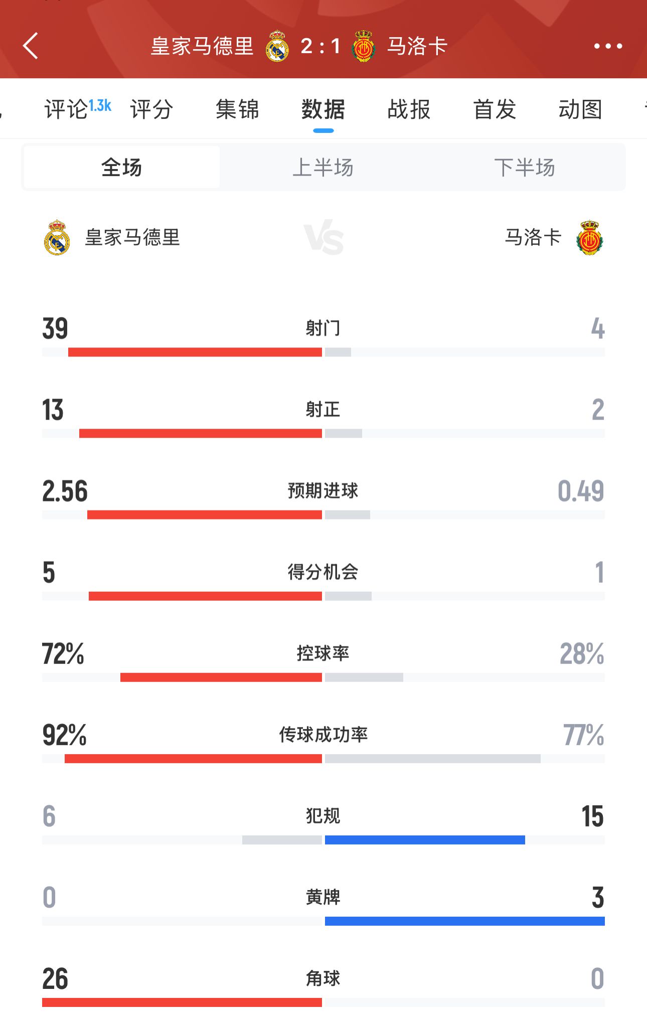 本场比赛,皇马狂轰39脚、射正13次、得到26个角球,而马洛卡射门4次、射正2次、0个角球。