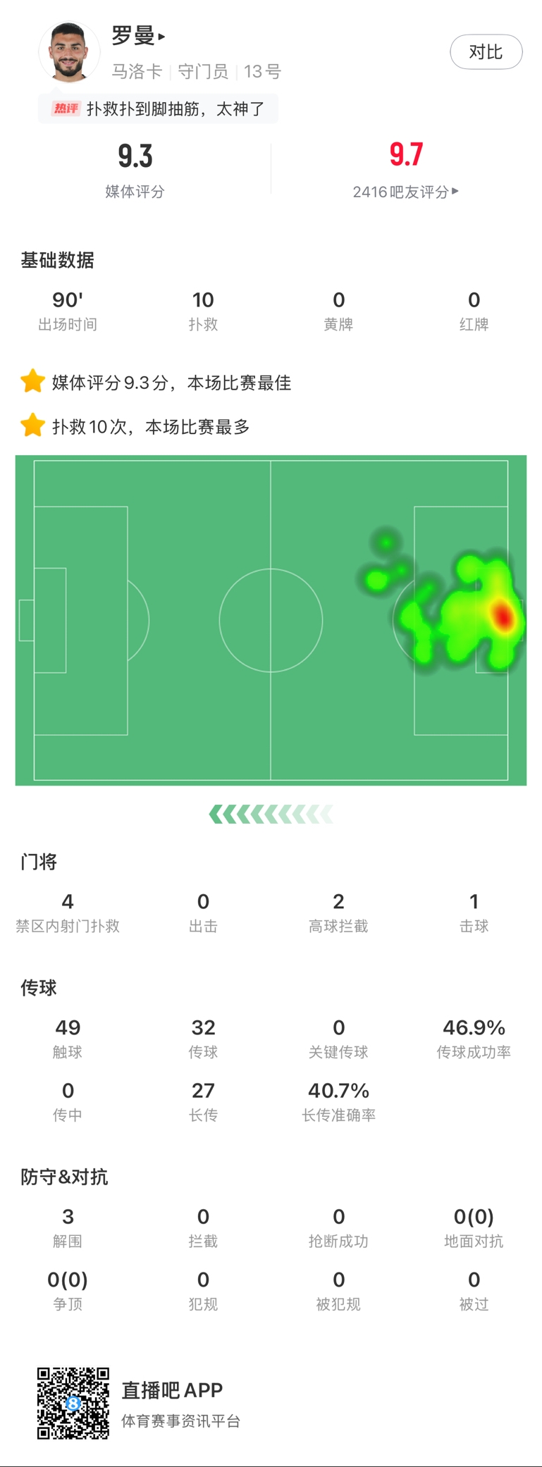 个人数据方面,马洛卡门将罗曼完成10次扑救,获评9.3分全场最高,赛后当选全场最佳球员。