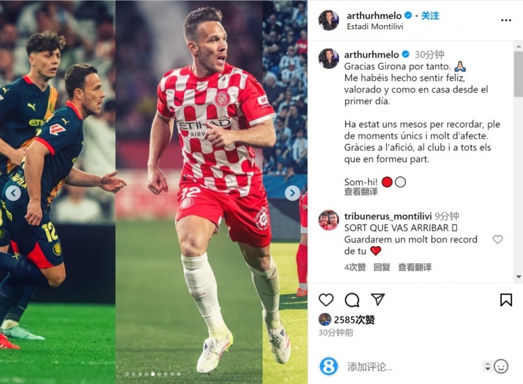 5月27日讯 阿图尔更新社媒动态,感谢赫罗纳俱乐部。