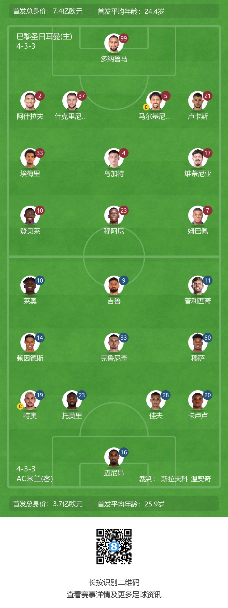 巴黎首发:99-多纳鲁马、2-阿什拉夫、5-马尔基尼奥斯、37-什克、21-卢卡斯-埃尔南德斯、4-乌加特、17-维蒂尼亚、33-埃梅里、10-登贝莱、7-姆巴佩、23-穆阿尼