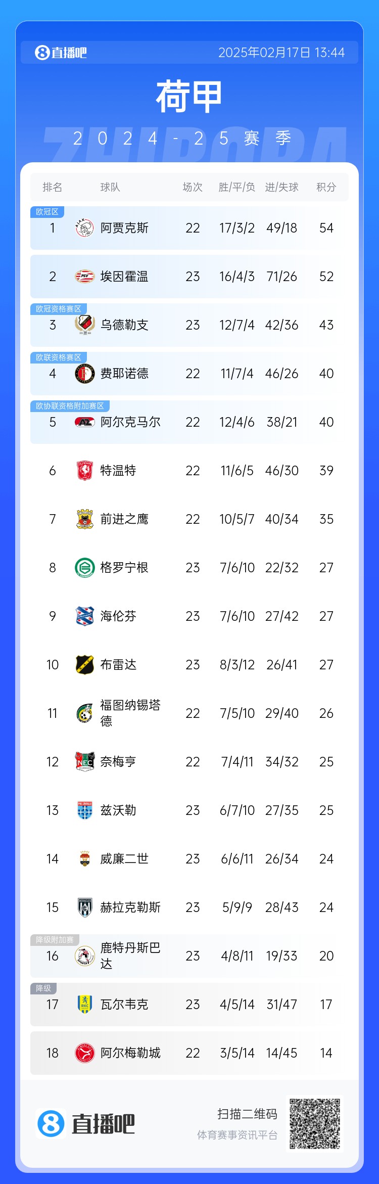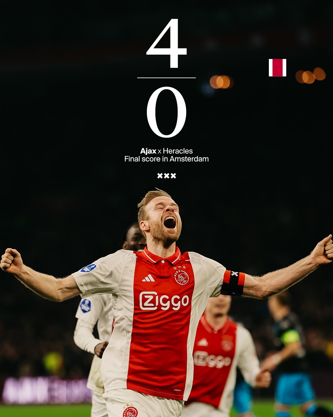 02月17日讯 荷甲第23轮,阿贾克斯4-0大胜赫拉克勒斯,联赛7连胜的同时,在少赛一轮的情况下,2分领跑荷甲。