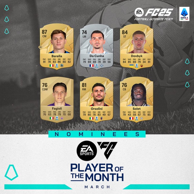 4月3日讯 意甲3月最佳球员候选公布,巴雷拉、达库尼亚、多夫比克、法乔利、奥尔索里尼、索勒6名球员获提名。