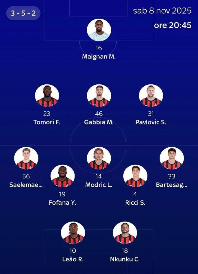 下面是意大利天空体育给出的预测首发: