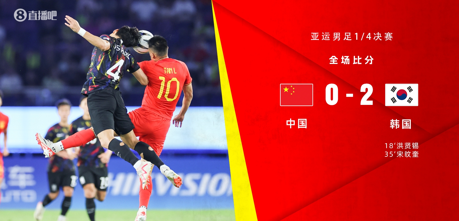 亚运会男足1/4决赛,中国vs韩国,洪贤锡任意球直接破门,韩佳奇奉献神扑后失误致丢球,朱辰杰伤退,戴伟浚头球中柱,最终中国0-2韩国止步八强,结束本次亚运会征程。