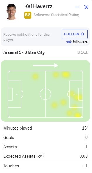 10月9日讯 在阿森纳1-0战胜曼城的比赛中,枪手攻击手哈弗茨替补出战15分钟,为马丁内利的进球送出助攻,SofaScore评分6.8。