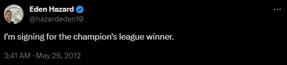 在2012年5月29日凌晨3点41分,阿扎尔在推特上写道:“我要加盟欧冠冠军了。”