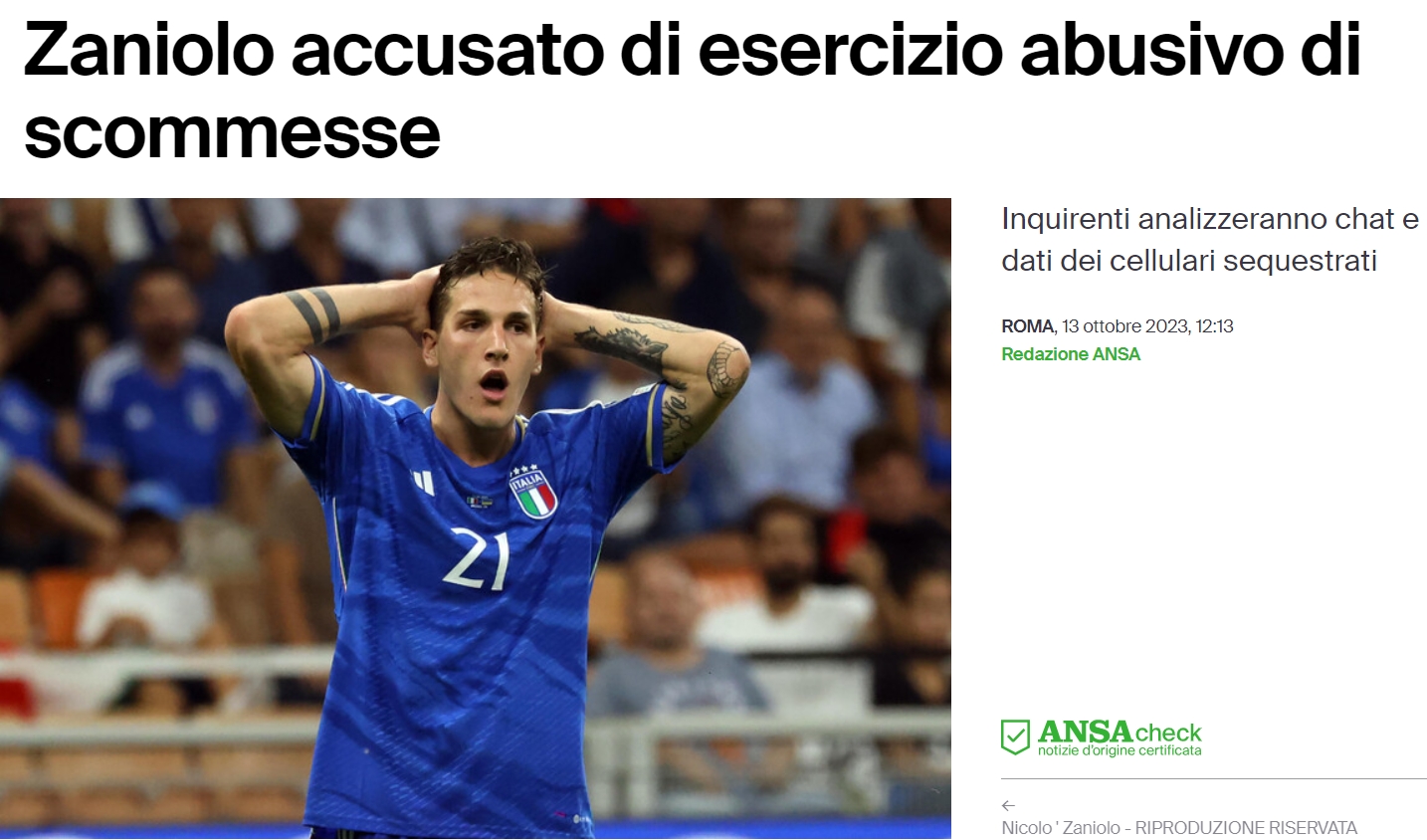 10月13日讯 据意大利安莎社最新消息,扎尼奥洛被指控非法赌博以及非法参与赌博活动。