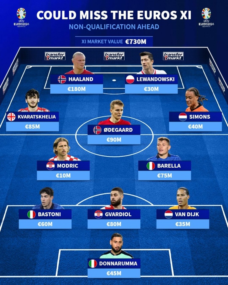 10月16日讯 欧预赛激战正酣,德转列出了截至目前可能错过欧洲杯的最佳阵,其中哈兰德、莫德里奇莱万在列。