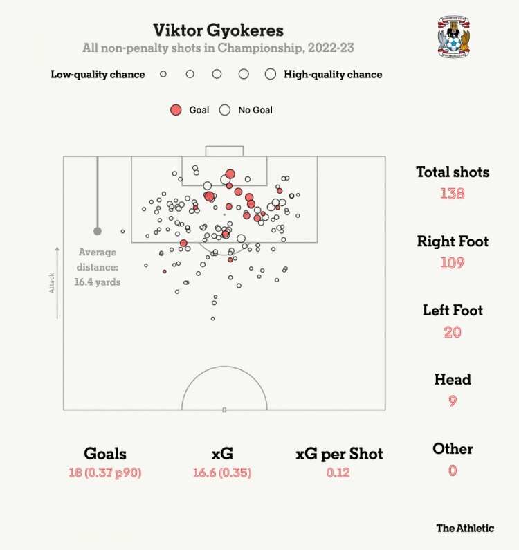 22/23赛季约克雷斯在英冠赛场上的非点球射门位置分布图