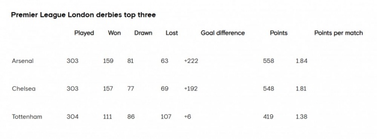 12月7日讯 本周末,切尔西将在英超迎战热刺,蓝军官方晒出了英超伦敦德比前三成绩,阿森纳排名第一,切尔西排名第二,热刺排名第三。