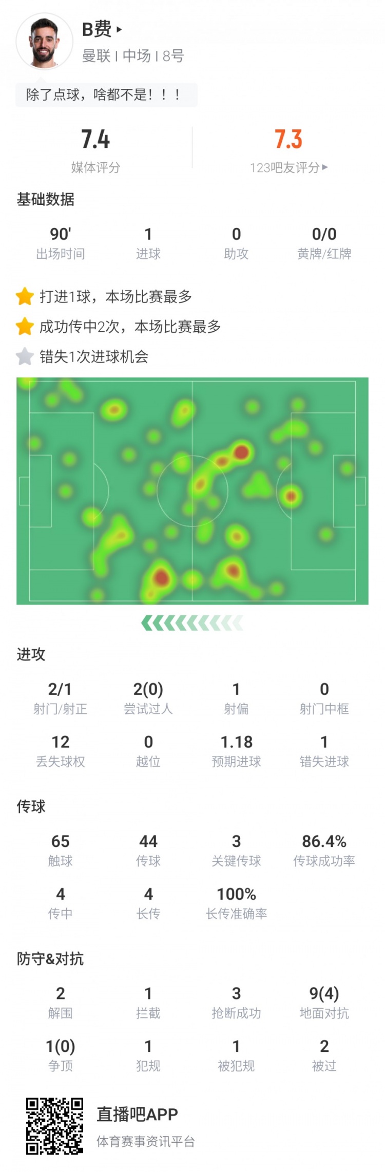 本场比赛,B费错失良机1次,2射1正,打进扳平点球;3次关键传球,2解围、1拦截、3抢断。