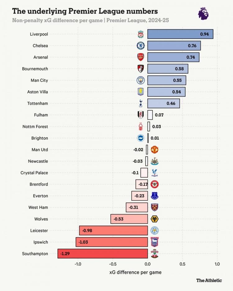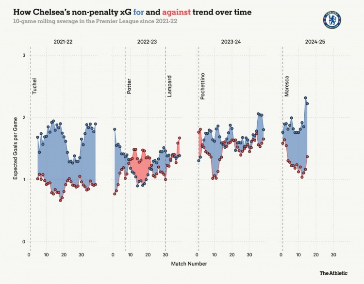 下图显示了马雷斯卡的比赛风格对切尔西所产生的影响。看看预期进球差值榜,你会发现切尔西只不过落后于利物浦。