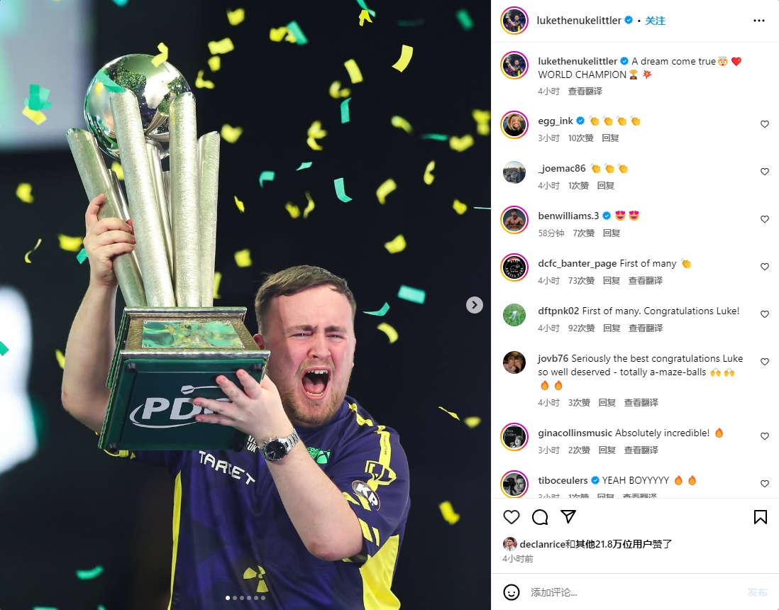 01月04日讯 2025年世界飞镖锦标赛,17岁英国飞镖神童卢克-利特尔夺冠,成为最年轻的飞镖世锦赛冠军。他在半决赛击败39岁的英国选手斯蒂芬-邦廷,决赛击败35岁的荷兰选手克尔-范格文。