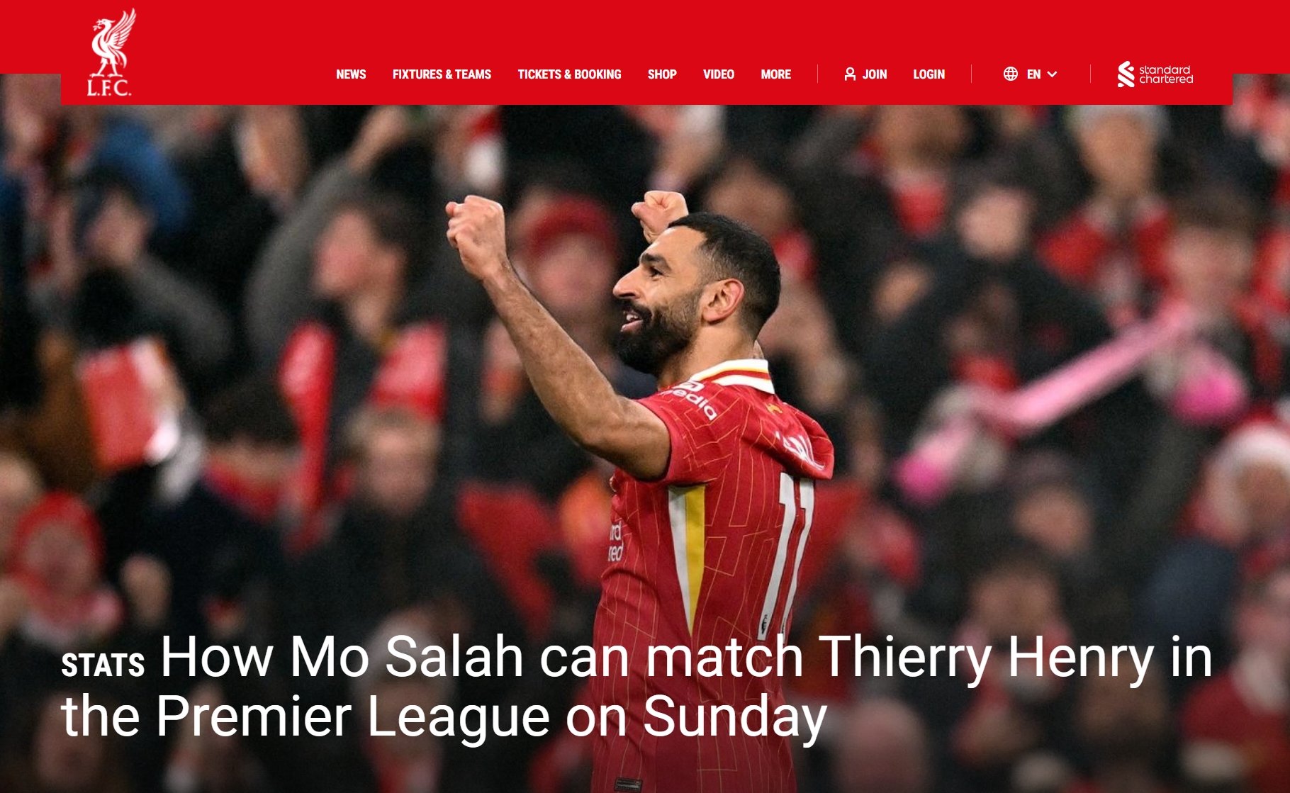 利物浦官网写道:本周末对阵曼联的比赛中,萨拉赫只要再攻入一球,就能在英超历史射手榜上追平亨利,以175球并列英超历史射手榜第7位。