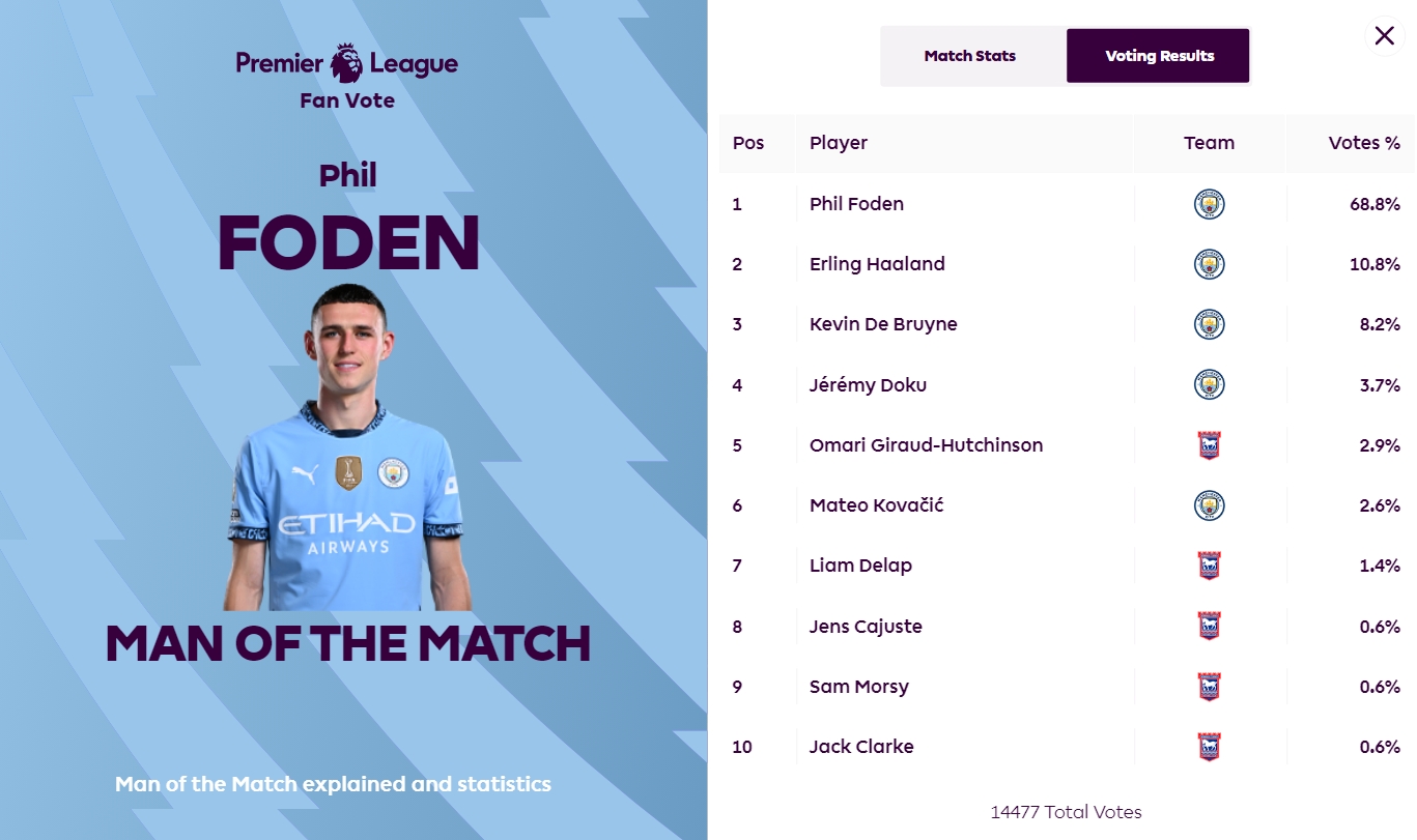 赛后,福登被英超官方评为全场最佳球员,他的得票率高达68.8%,位居次席的哈兰德得票率仅为10.8%。