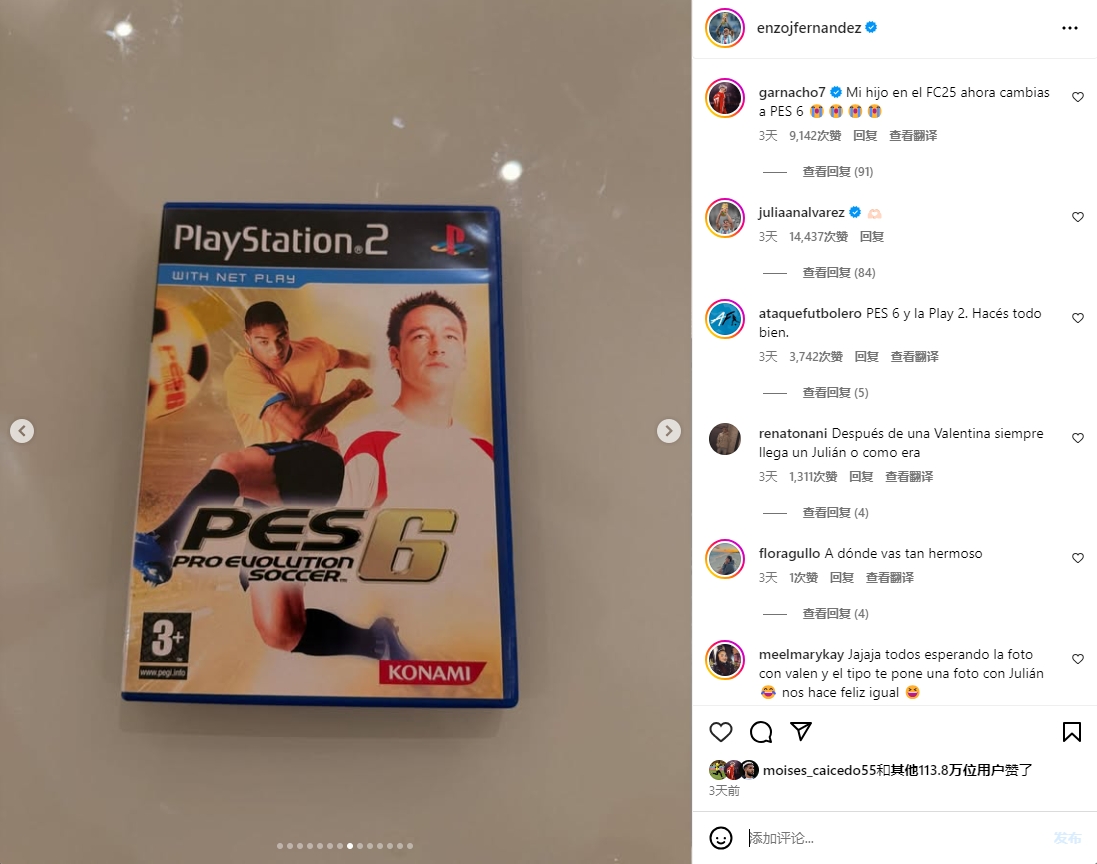 恩佐3天前发布24岁生日动态,晒出实况足球10和PS2,加纳乔评论:我儿子(恩佐)在FC25,现在你转实况足球10(PES 6)了
