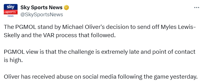 天空体育援引《镜报》记者达伦-刘易斯的说法称,英超裁判公司支持奥利弗在球场上的决定以及随后的VAR流程。
