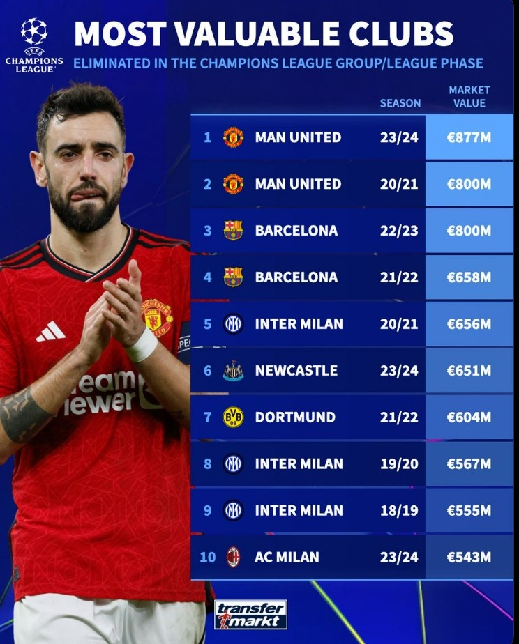 1月29日讯 本赛季欧冠联赛阶段末轮即将打响,巴黎、曼城仍有被淘汰的可能。德转也盘点了欧冠历史上第一阶段(包括此前的小组赛)被淘汰身价最高的球队,其中曼联、巴萨、米兰双雄都有上榜,具体情况如下: