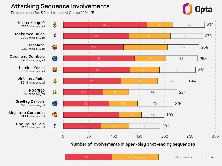 3月15日讯 opta统计了本赛季五大联赛球员各项赛事运动战参与最终转化为射门的进攻次数情况,姆巴佩力压萨拉赫居首。