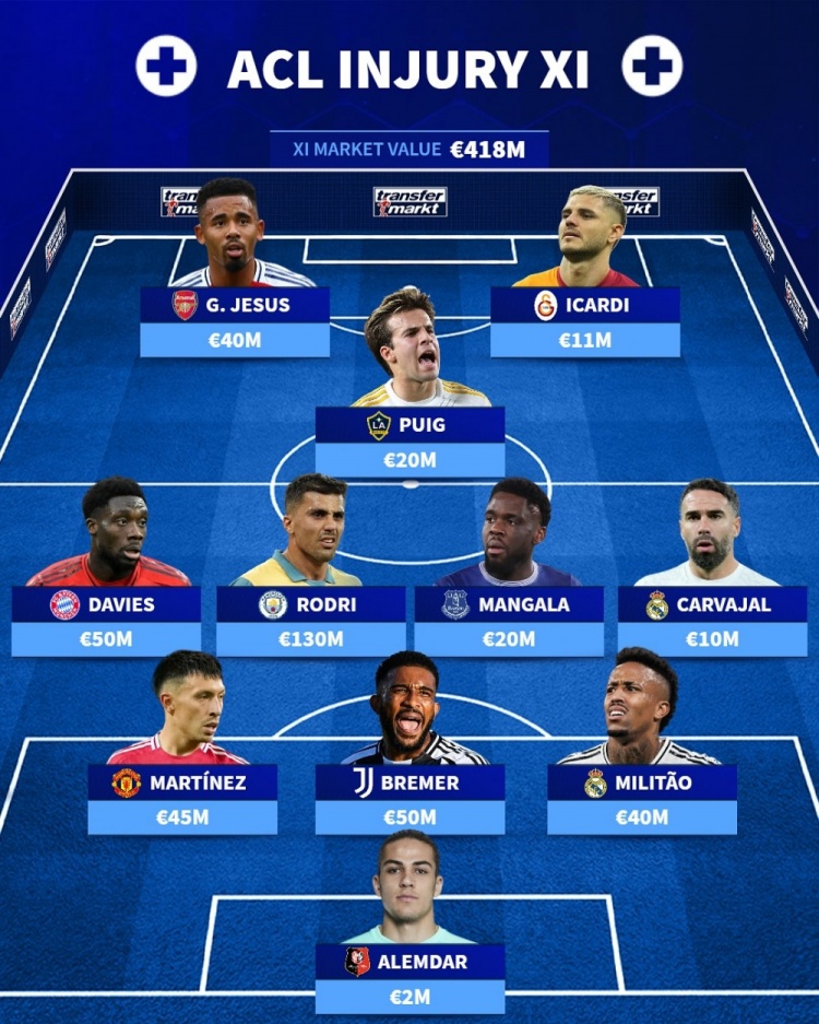 德转排本赛季十字韧带受伤阵容(总价4.18亿欧):