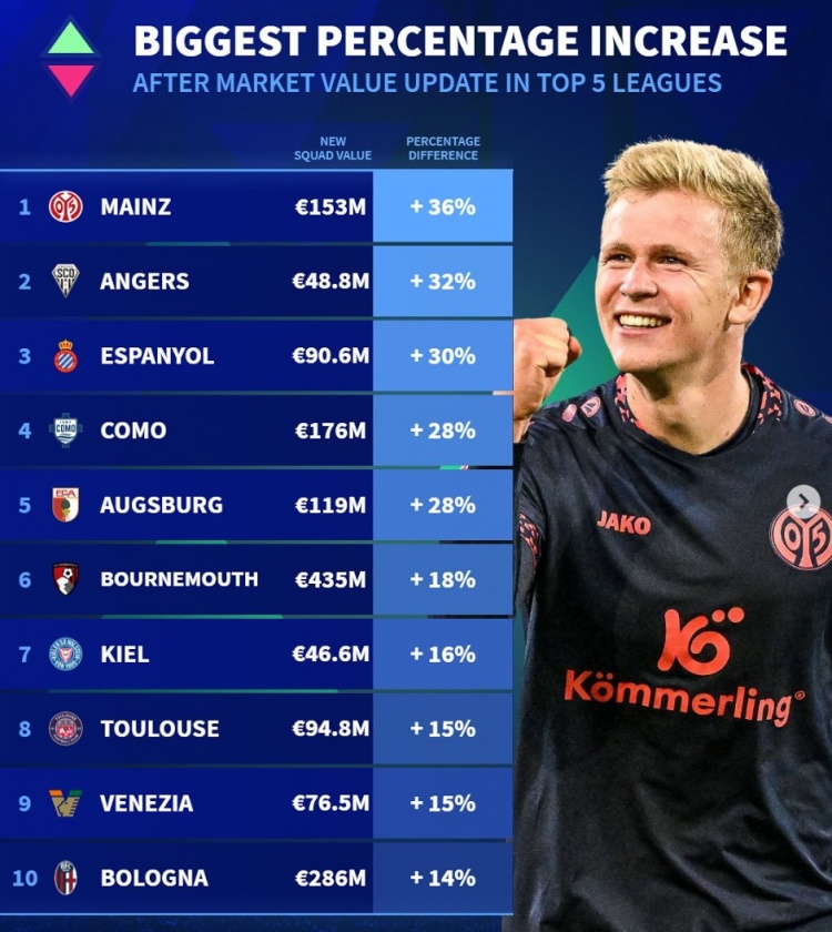 3月28日讯 《转会市场》已经更新了五大联赛球员身价,也统计了本期更新各队身价升值比例情况。