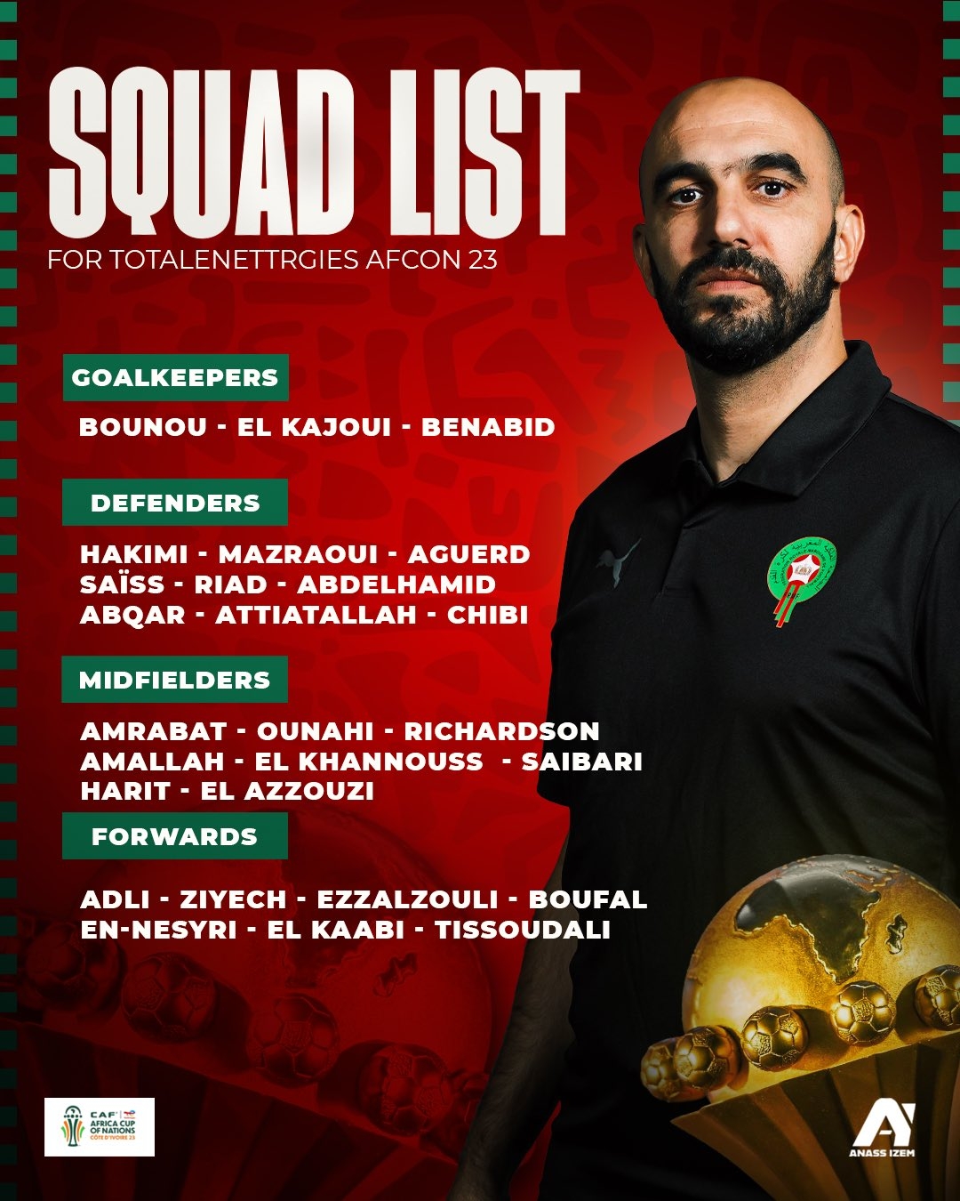 12月28日讯 摩洛哥公布非洲杯大名单,阿什拉夫、阿姆拉巴特、马兹拉维、齐耶赫、恩-内斯里等球员均入选。