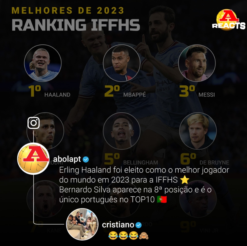 葡萄牙媒体《球报》在ins晒出IFFHS评选的年度最佳球员排名,C罗评论: