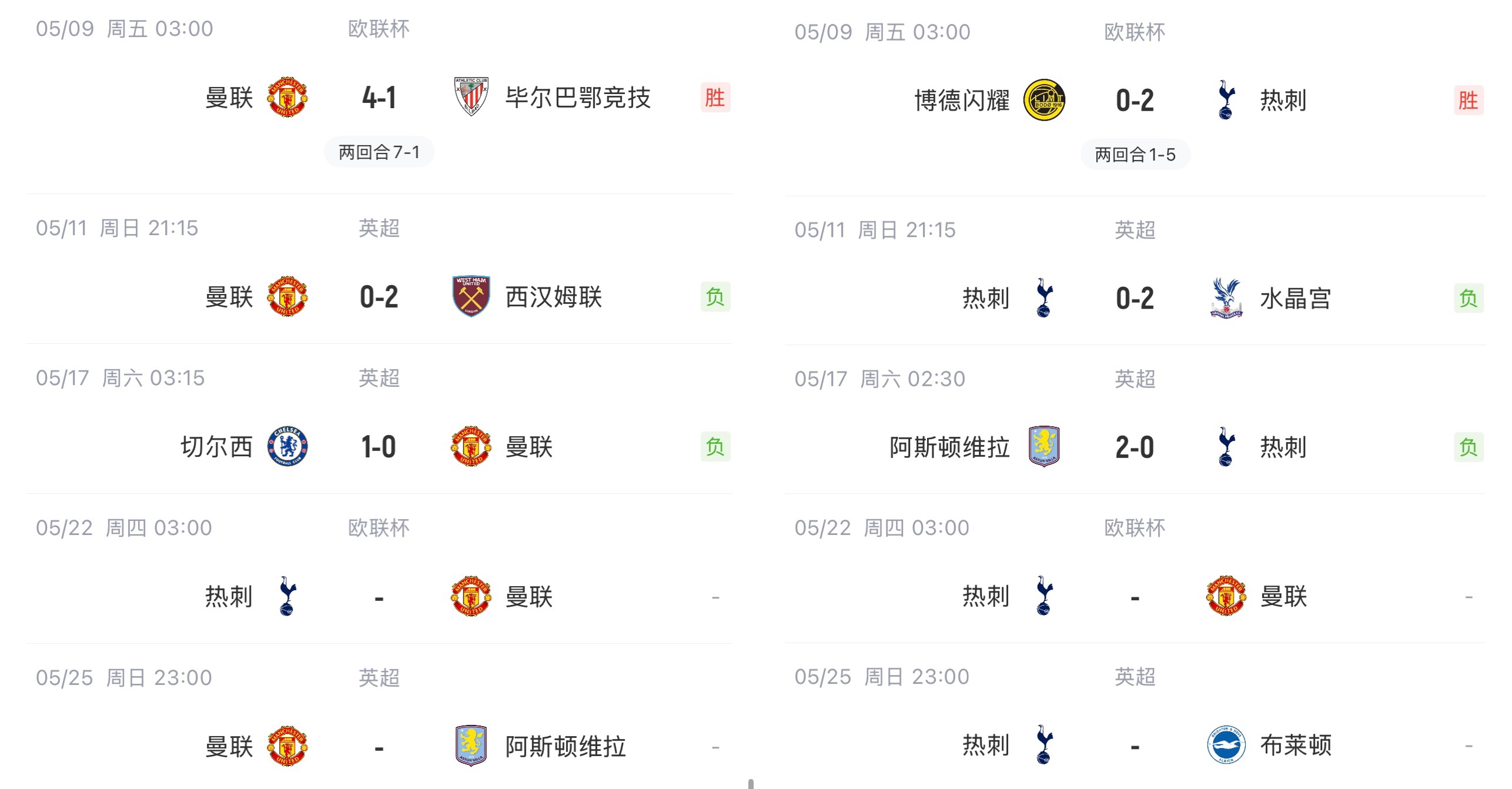 目前,曼联排名英超第16,热刺排名英超第17。下一场比赛,两队将在欧联决赛相遇,争夺下赛季的欧冠资格。
