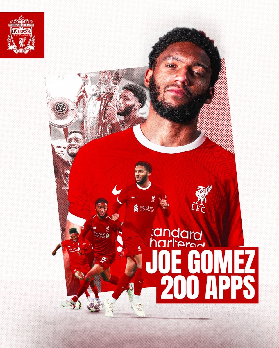 据利物浦官方统计,乔-戈麦斯迎来生涯里程碑,这是他代表利物浦出战的第200场比赛。