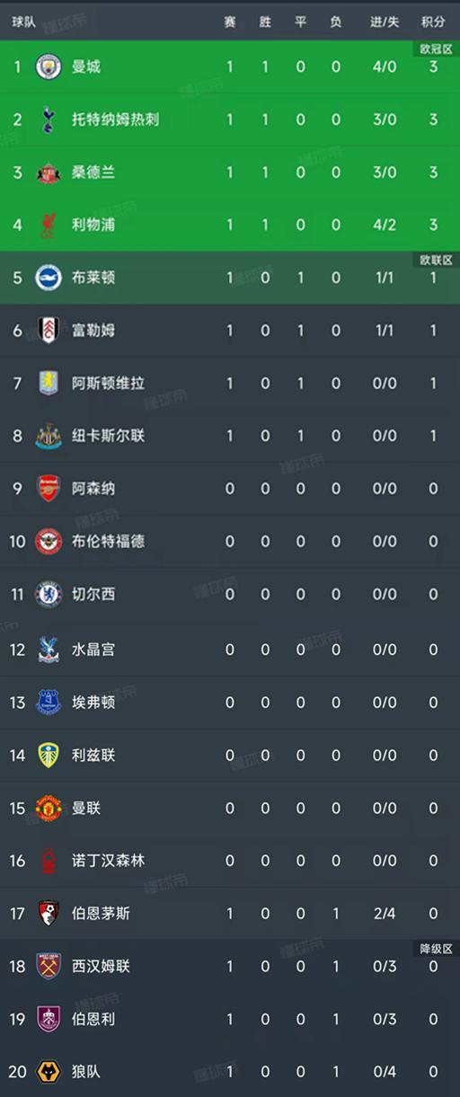 北京时间8月17日,新赛季的英超第一轮已经结束了6场比赛,我们一起看看最新的积分榜变动,曼城、热刺、利物浦传统豪强顺利全取三分。