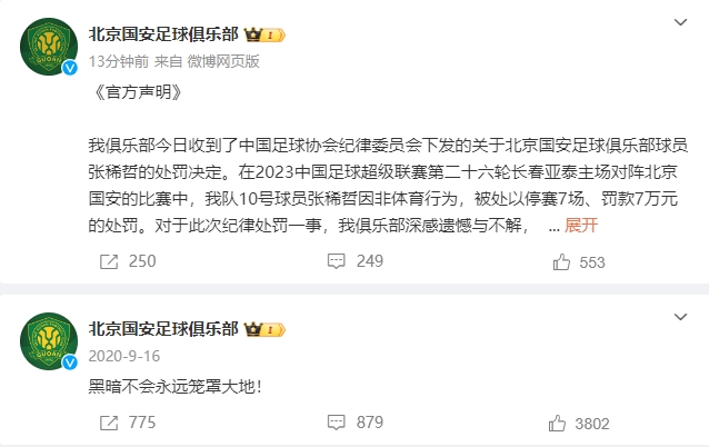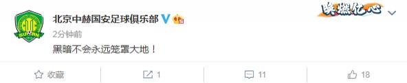 值得一提的是,国安在三年前也用了相似的文案抗议判罚。在2020赛季中超联赛第11轮,北京国安3-3河北华夏幸福,赛后国安官方微博发布言简意赅的一句话,声称:黑暗不会永远笼罩大地!