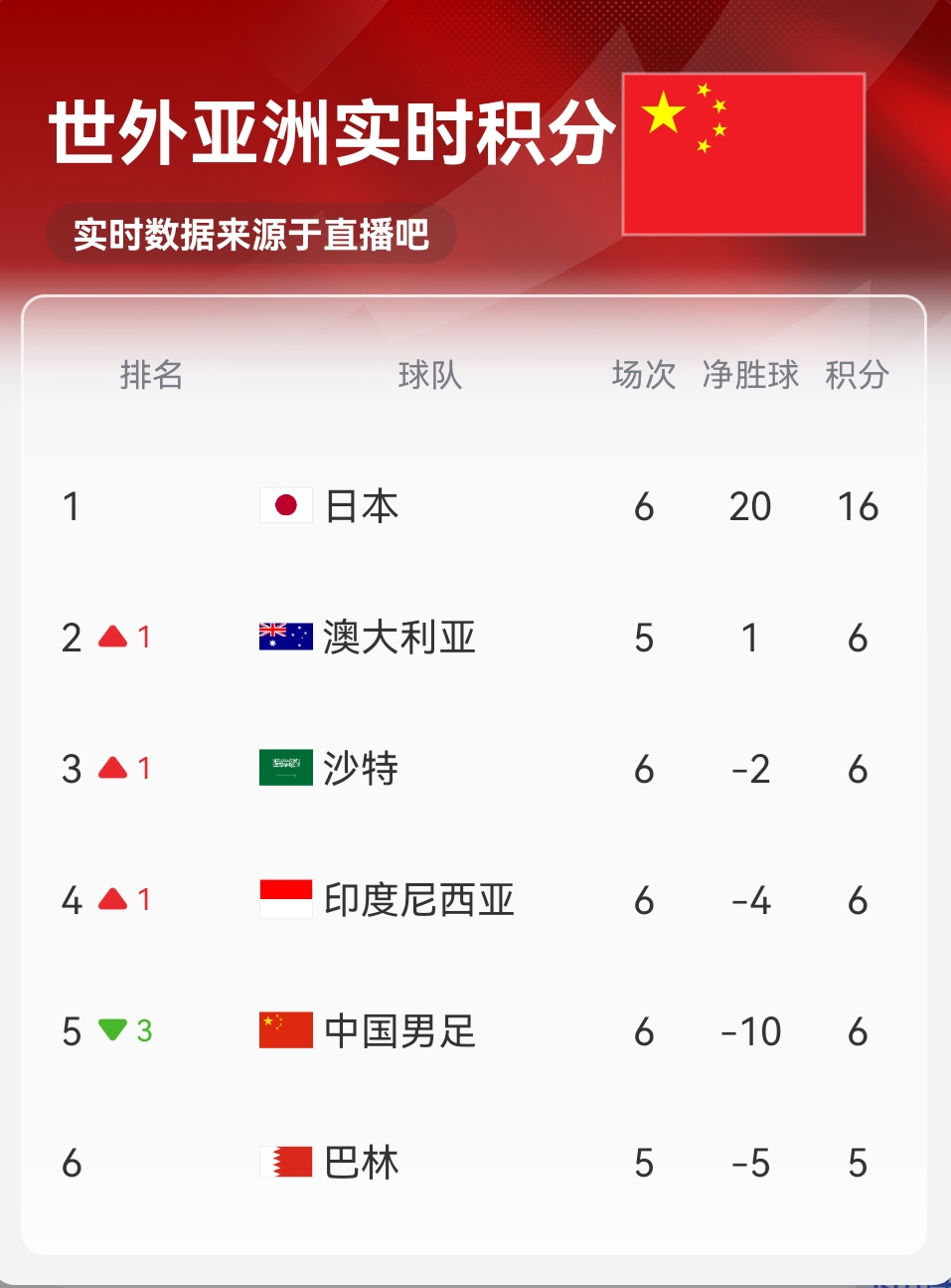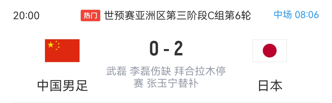 11月19日讯 18强赛C组第6轮20点同时开球,半场比分中国0-2日本、印尼1-0沙特!