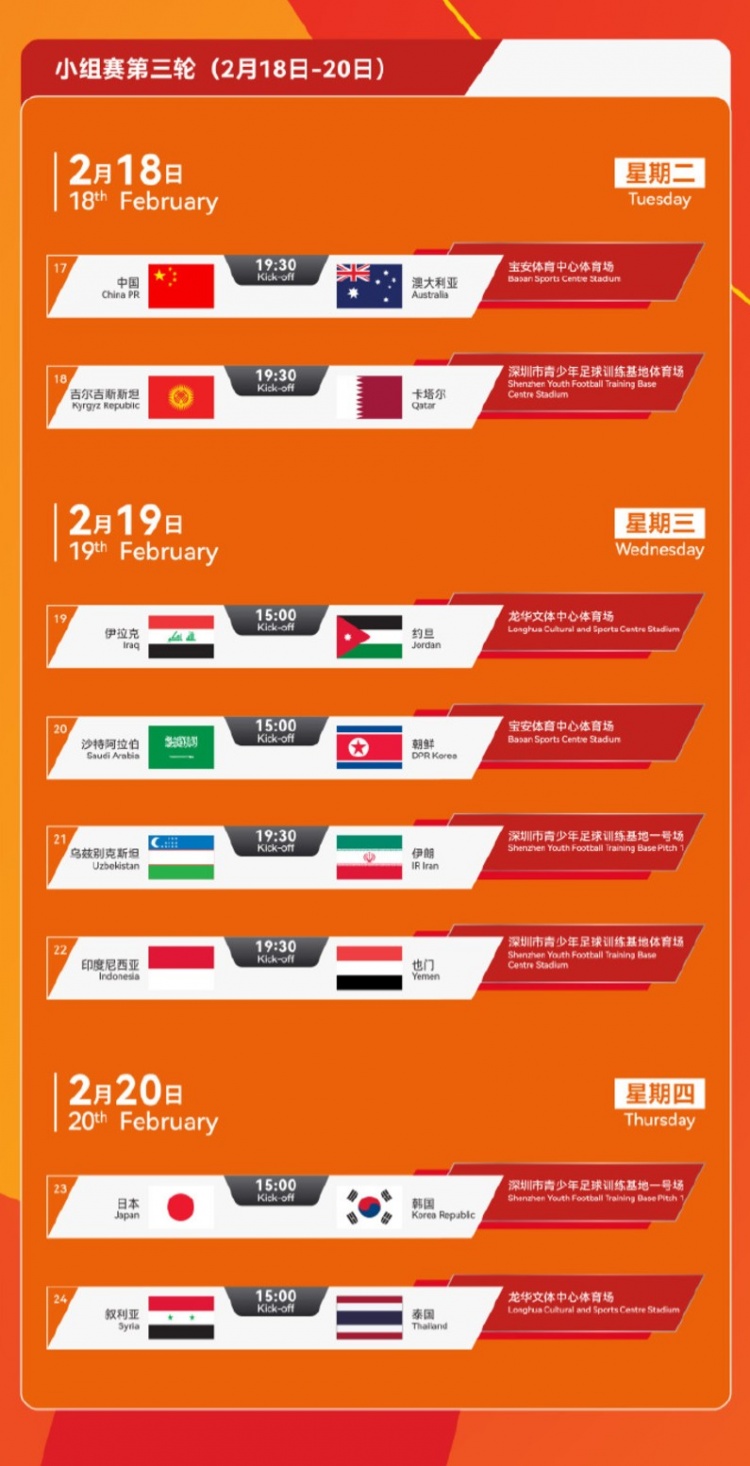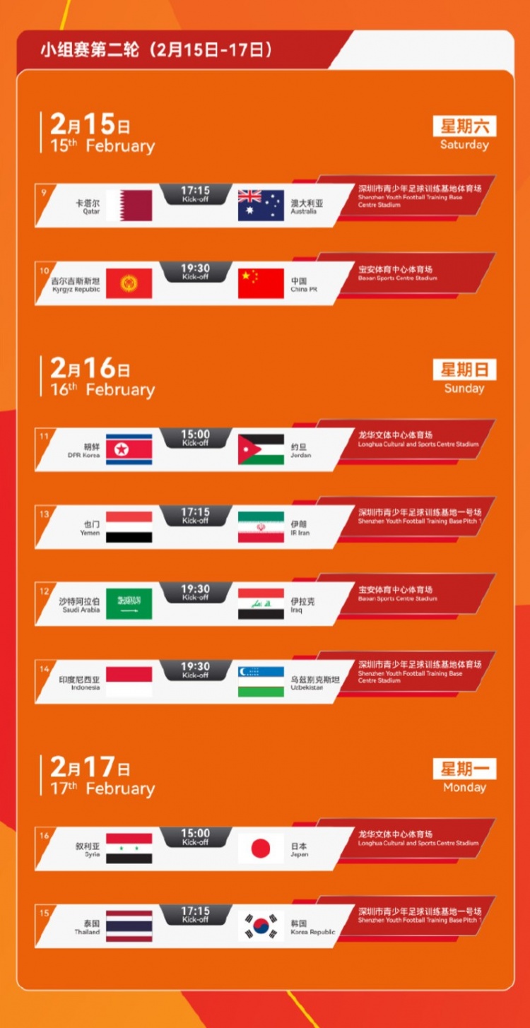 2月12日19:30中国队vs卡塔尔队(揭幕战),深圳市青少年足球训练基地体育场
