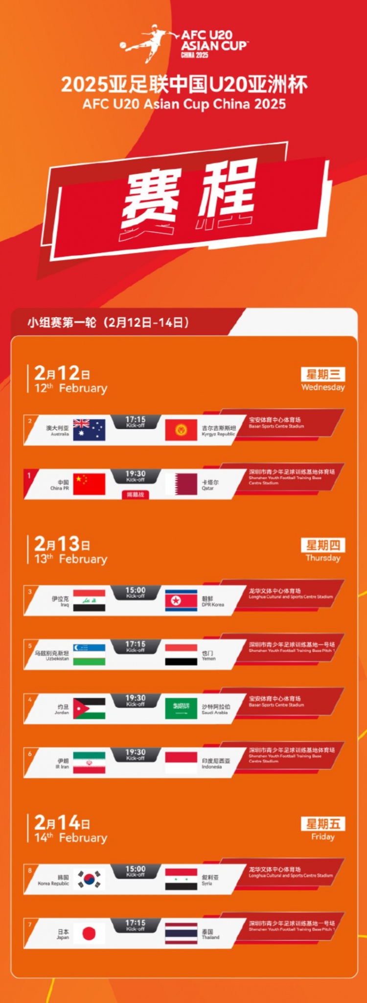 12月2日讯 官方消息,2025年U20亚洲杯赛程公布,比赛将于明年2月12日至3月1日在深圳举行,前4名获得U20世界杯参赛资格,揭幕战中国队2月12日19:30对阵卡塔尔。