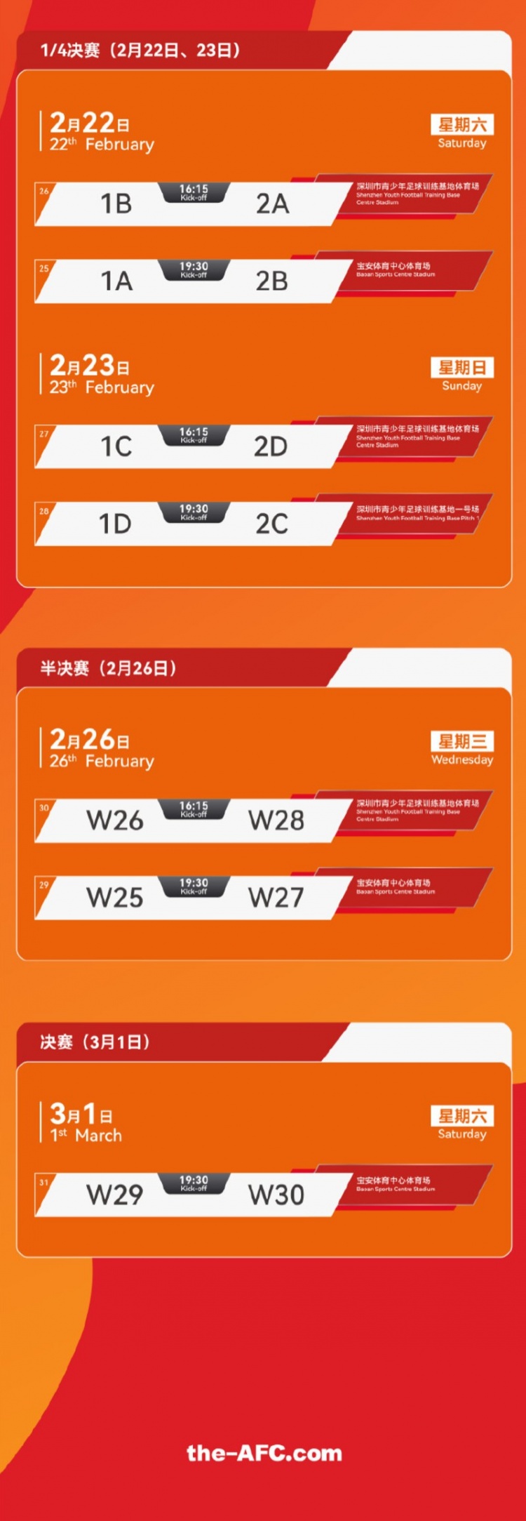 根据赛程安排,本届U20亚洲杯小组赛2月12日-20日进行,1/4决赛2月22日和23日进行,半决赛2月26日进行,决赛3月1日进行。