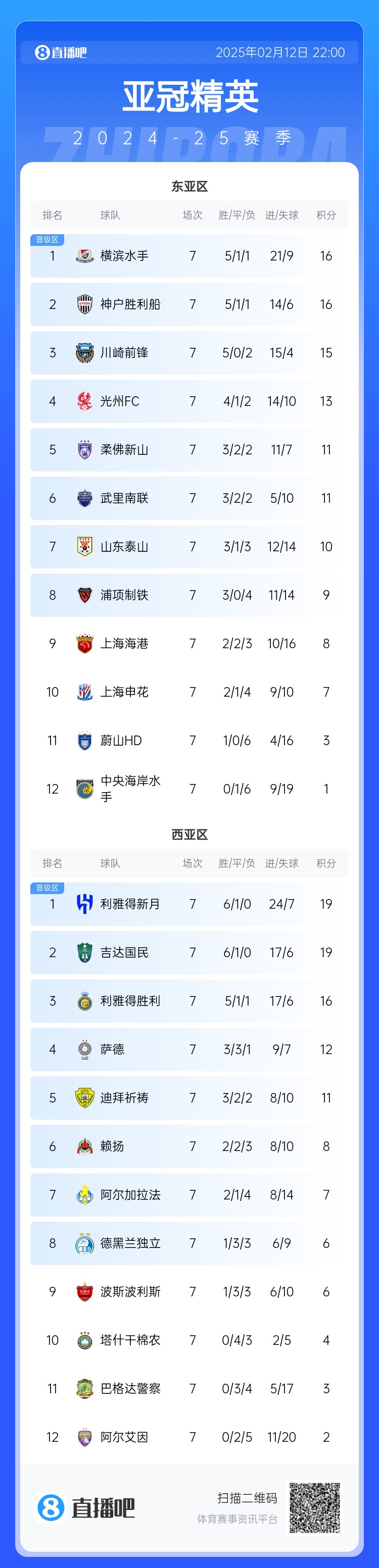 中超3支球队在本轮亚冠取得1胜2负的战绩,目前仅山东泰山排在第7,身处晋级区,上海海港排名第9上海申花第10。