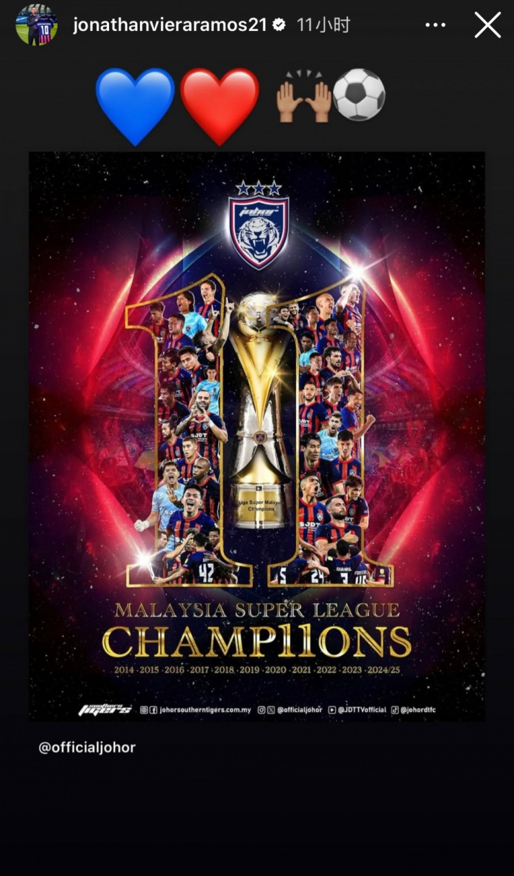 24日进行的马来西亚超级联赛第22轮比赛,柔佛新山主场2-0击败霹雳,提前4轮问鼎本赛季冠军。赛后,比埃拉晒出了夺冠的海报,并附上了多个表情庆祝柔佛新山提前夺冠。