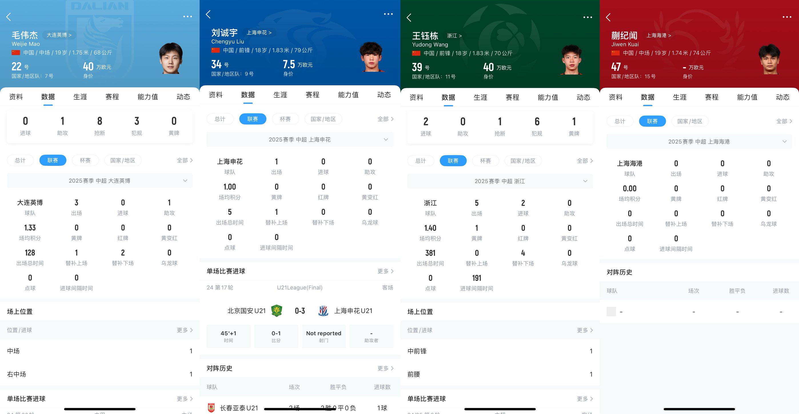 18岁的王钰栋本赛季斩获中超首球,并在昨晚又收获一球,本赛季出战5场打进2球;18岁的刘诚宇上个月在申花完成中超首秀;19岁的毛伟杰在中超第2轮英博对阵泰山的比赛中首发完成首秀,并送上1次助攻,本赛季中超已出场3次。