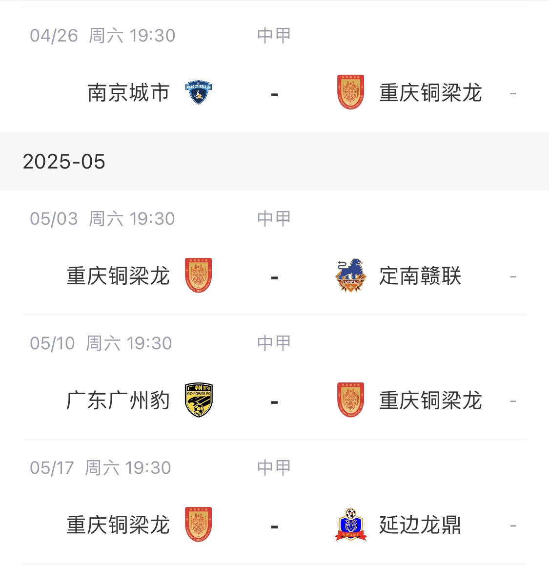 重庆铜梁龙接下来的赛程: