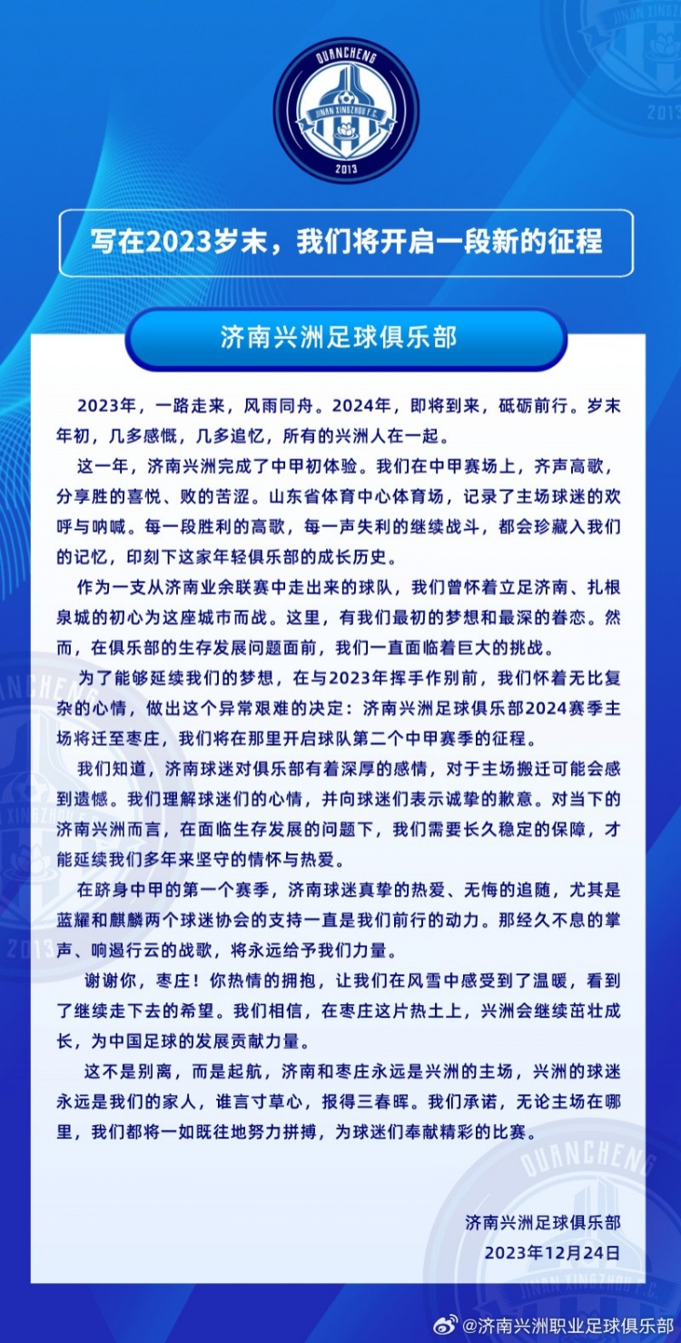 济南兴洲俱乐部官方公告中表示,俱乐部的生存发展问题一直面临巨大的挑战,因此做出了异常艰难的决定,2024赛季主场将迁至枣庄,在那里开启球队第二个中甲赛季的征程。