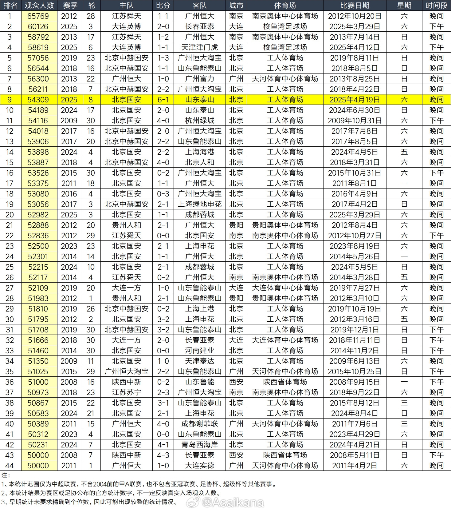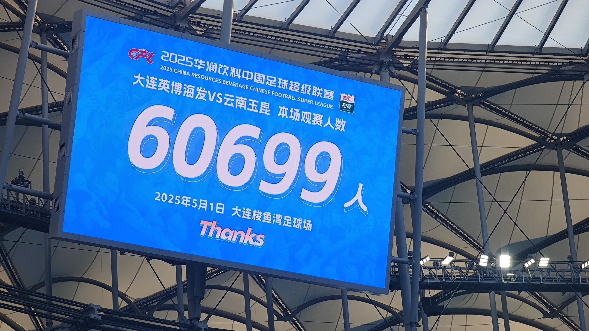 05月01日讯 大连英博主场vs云南玉昆上座人数达到了60699人,将之前刷新的中超历史第二上座纪录再度提升,目前仅次于2012年南京奥体的65769人。
