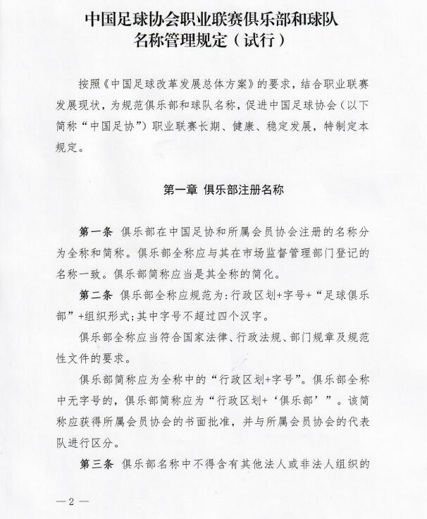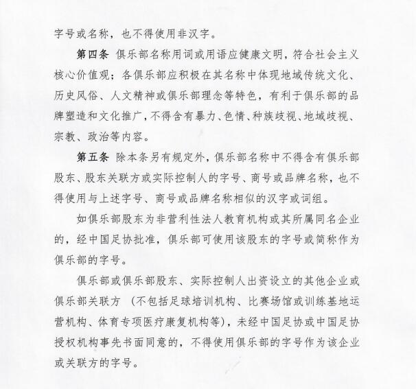 1月3日讯 足协公布《中国足球协会职业联赛俱乐部和球队名称管理规定(试行)》,对于俱乐部注册名称,规定不得含有俱乐部股东的字号、商号或品牌名称。