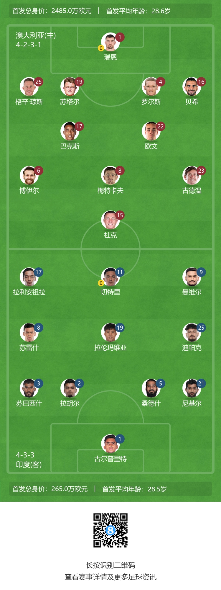 澳大利亚首发:1-马修-瑞安、4-罗尔斯、16-贝西、19-苏塔尔、25-格辛-琼斯、8-梅特卡夫、17、巴克斯、22-杰克逊-欧文、6-博伊尔、23-古德温、15-杜克