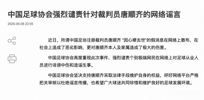 北京时间9月8日晚,中国足协官方发布声明,对网络上针对37岁的“中超金哨”唐顺齐的谣言表示强烈谴责。