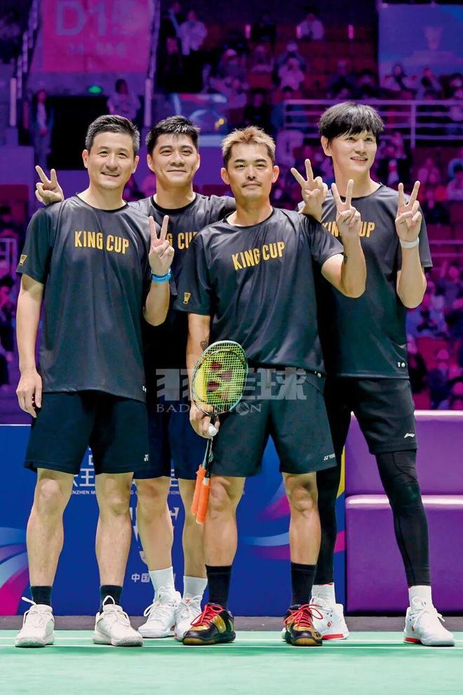 那一刻,他们不再是被反复书写的“黄金一代”,只是重新聚在一起的老战友——彼此熟稔、毫不设防,在轻松的玩笑与心照不宣的默契中,回味着那段跨越时空的“老友记”。表演赛最后,大屏幕上放出2005年在北京苏迪曼杯夺冠后的四人合影,青葱时光映入眼帘,他们现场复刻二十年前的大合影站位,重新肩搭着肩,比出胜利的手势,再次留下追梦少年的经典同框。