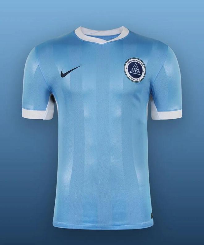 深圳新鹏城主场球衣以辽阔的天蓝色作为主色调,对滨海气质凝练表达,代表新生力量的纯粹初心和凌云壮志。